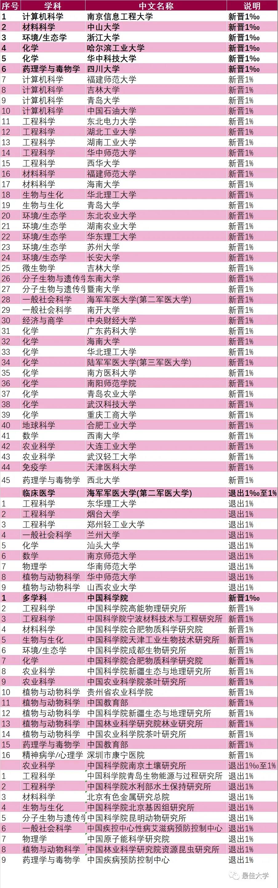 新晋千分之一学科六个分别为南京信息工程大学的计算机科学、中山大学的材料科学、浙江大学的环境/生态学、哈尔滨工业大学、华中科技大学的化学、四川大学的药理学与病毒学,另外有一个学科退出。全国有39个学科晋升全球前1%,包括福建师范大学、吉林大学、青岛大学、中国石油大学的计算机科学,福建师范大学等大学的材料科学。福建师范大学一次性进入2个学科。广东也有暨南大学、广东医科大学、南方医科大学等三所高校的学科新晋。另外还有9个学科退出前1%。机构方面也有新增和退出。