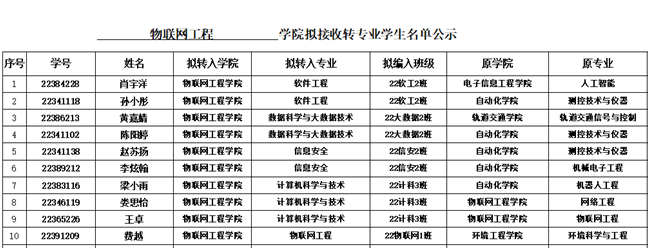根据2023年度本科生转专业工作安排,经学生本人申请、所在学院(系)批准、接收学院(系)考核,经学院领导审核,2023年秋季学期全校共有10名学生通过转专业考核拟转入我院,现将拟转入学生名单公式如下。本公示期为5天(2023年9月14日至2023年9月18日),如有异议,请于公示期内及时向我院院办反映。