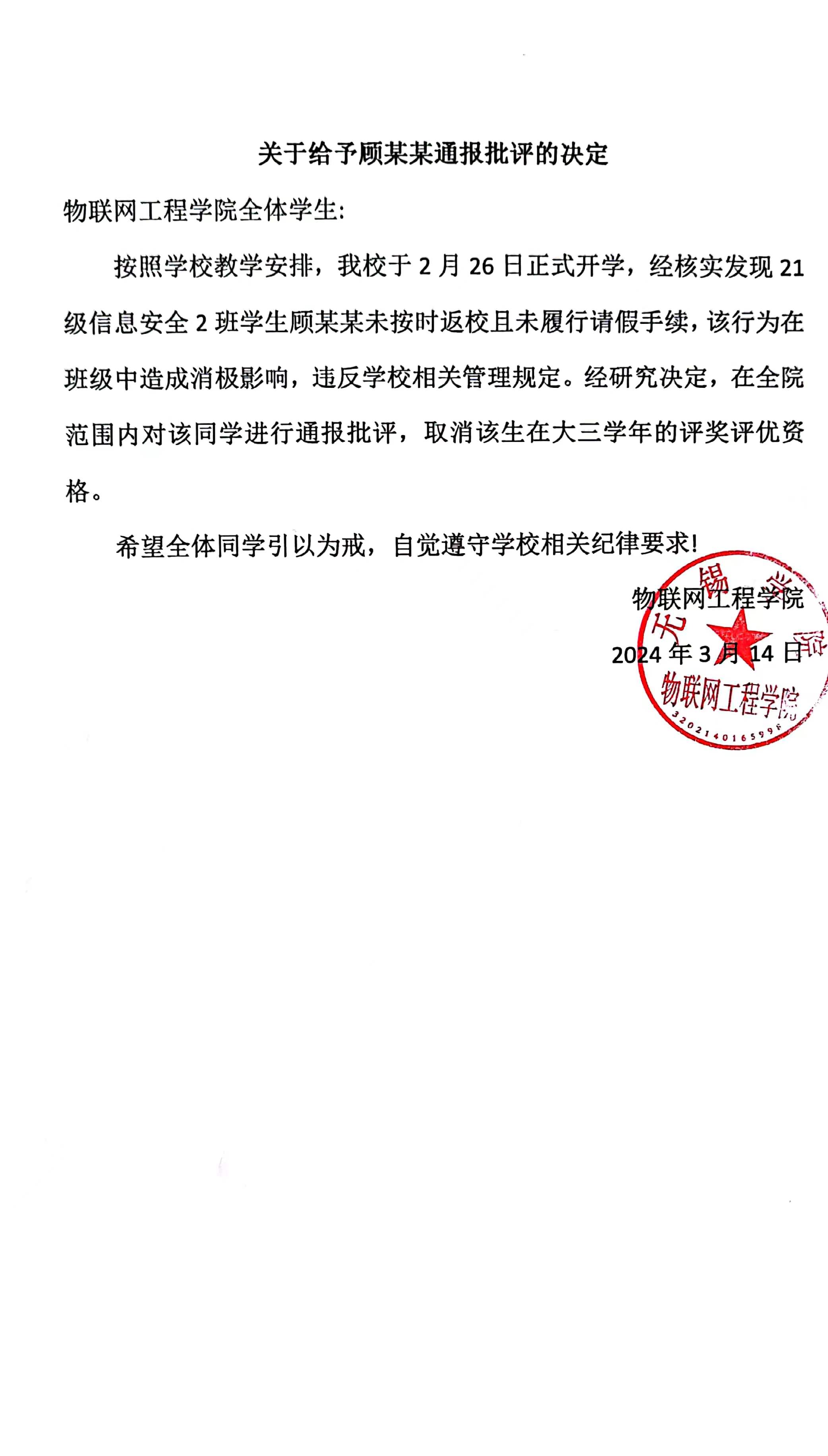 关于给予顾某某通报批评的决定