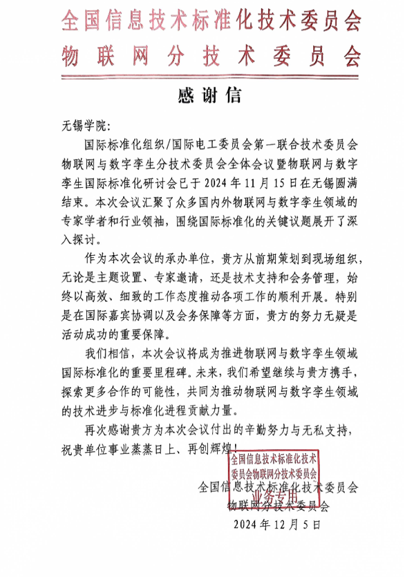 此次会议的成功举办,展现出我校卓越的组织能力和专业水平,赢得了与会国内外嘉宾和专家的高度赞赏。近日,全国物联网分技术委员会专门发来感谢信,对我校所做出的贡献表示衷心感谢,并充分肯定了我校在推动物联网与数字孪生国际标准化方面所作出的突出贡献。(物联网工程学院/文、图:陈祺东;审核:王泉)