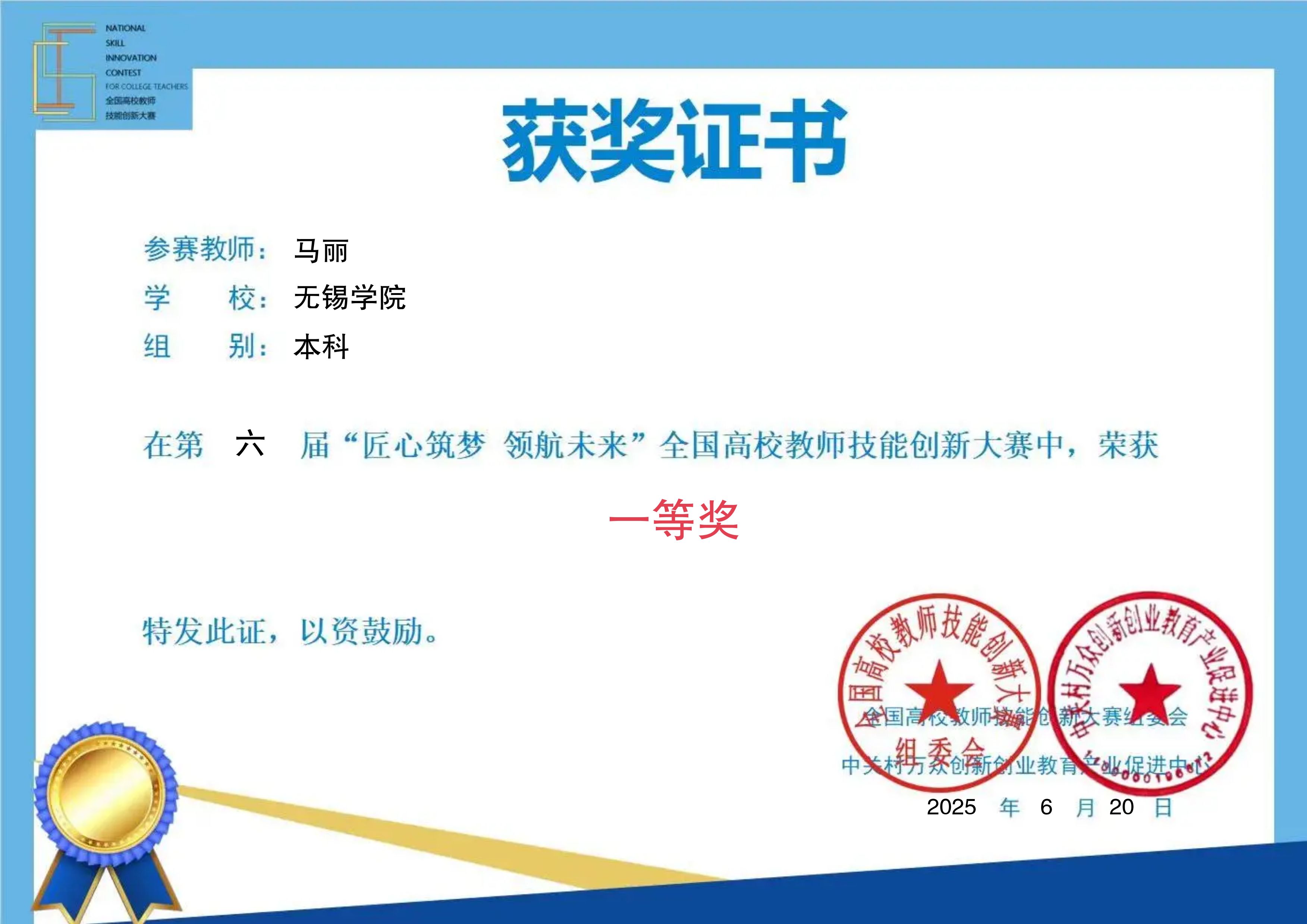 日前,第六届“匠心筑梦 领航未来”全国高校教师技能创新大赛决赛落下帷幕,我院教师马丽经过多轮环节的激烈角逐,在309所高校1057组复赛队伍中脱颖而出,荣获全国一等奖,实现我院教师教学竞赛的再次突破。