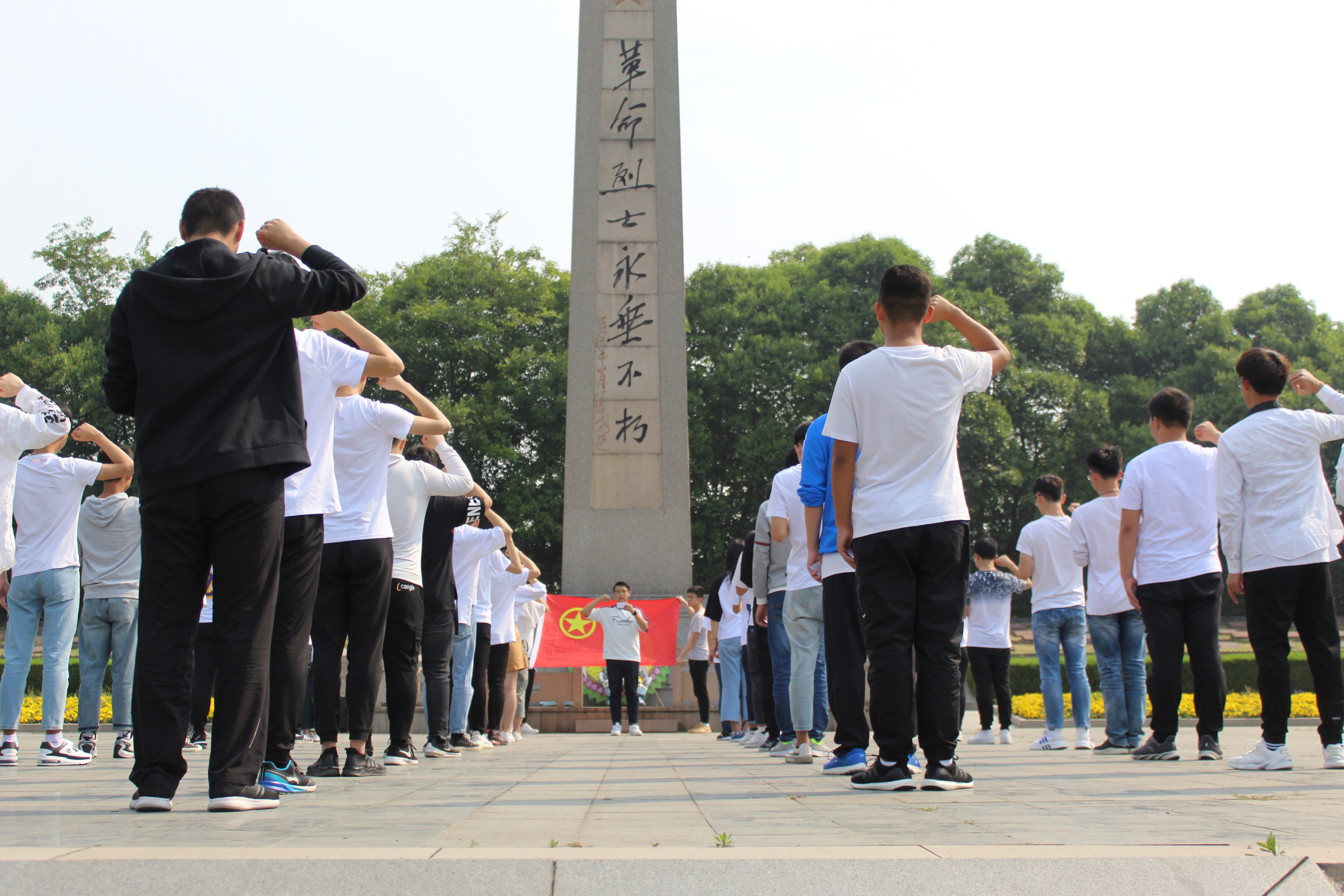 首先,师生们共同来到锡东烈士陵园。进入烈士陵园后同学们被陵园中庄严肃穆的气氛所感染,在庄严肃穆的烈士纪念碑前,同学们肃然起敬,带着对烈士们的敬重与哀悼之情,齐唱了中华人民共和国国歌。在优秀学生代表的领誓下,同学们右手握拳,昂首挺胸,用慷慨激昂地语调庄严宣誓。最后,由20位优秀团员组成的代表团为革命烈士献花,使大家在庄严肃穆的仪式中接受了“沉浸式”精神洗礼。