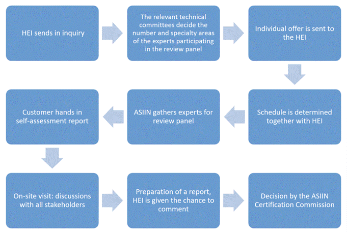 在培训项目的认证中,我们根据客户的个性化需求进行调整。从咨询到决策的流程通常最多需要16周。该流程主要基于项目认证程序的结构,但在个别课程或模块的认证中,也可以通过简化的桌面审查和在线讨论进行。ASIIN Consult团队乐于支持客户开发适合其需求的流程。一般来说,认证流程遵循以下步骤: