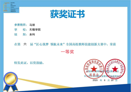 Recently, the final of the 6th "Craftsmanship and Dream Building, Leading the Future" National College Teachers' Skills Innovation Competition came to a close. After several rounds of fierce competition, Ma Li, a teacher from our college, stood out from 1,057 teams from 309 colleges and universities in the semi-finals and won the national first prize, achieving another breakthrough for our college's teachers in teaching competitions.
